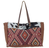 This multi-color, multi-textured, beautifully patterned Myra bag is ideal for weekend wear and career wear. This beautiful roomy bag features a cowhide upper section with leather handles and a concho accent magnetic closure strap. Pocket on the outside back, pocket on the inside and a top zipper make it easy to carry all the items you need.