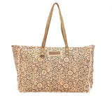 This large and roomy floral patterned weekender bag in pale peach and brown tones features a top zipper closure and inside pockets. Leather handles.