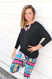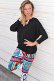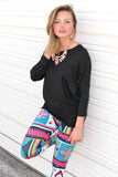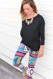 You will love our "Living on the Edge" stretch leggings with their colorful aztec print. Colors include hot pink, mint, teal, orange, white and black. They are super comfy and cute. Elastic waist and stretchy one size fits most.