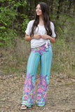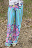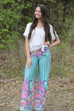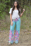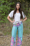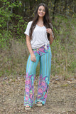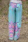 Our POP SUGAR YOGA PANTS feature a turquoise background with a fun mixed paisley print. Give a pop to your wardrobe in these fun and comfy pants.