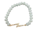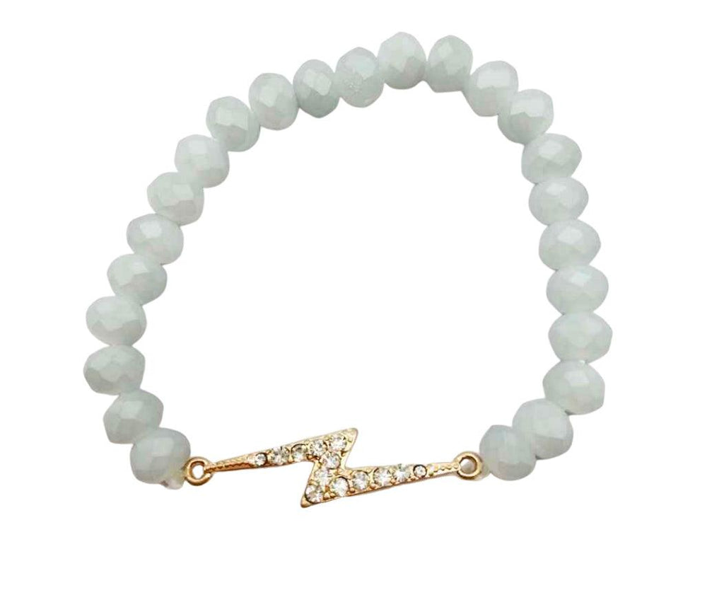 Grey faceted beaded stretch bracelet with gold tone lightning bolt.