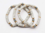 This stack includes three speckled light gray beaded bracelets. These bracelets have gold tone accents with square gray beads. Mix them with other bracelets, wear them together or wear them alone.