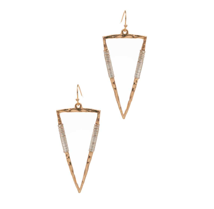 Get ready to fall in love all over again with our Back for Love Earrings! These playful, worn gold tone earrings feature a unique inverted triangle design, accented with hammered details and silver wire wrapping. Perfect for adding some fun and flair to any outfit.