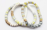 This bracelet stack includes three beaded stretch bracelets. Bracelets are multi-colored beads. One of the bracelets spells out "blessed". Wear them together or alone.