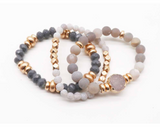Set of three multi-beaded natural stone stretch bracelet stack. Includes shades of gray and gold tone beads with a druzy pendant. Wear them together or alone.
