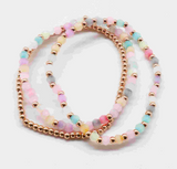 Dainty set of 3 bracelet stack. One gold tone beaded bracelet and two multi-colored pastel and gold tone beaded bracelets. Wear them together or alone.