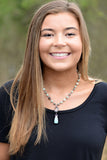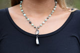 This gorgeous necklace features a mixture of pastel blue and cream crystal beads and dalmatian beads with a pretty soldered glass pendant and soldered blue stone pendant.