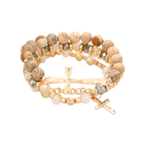 Set of three multi-beaded stretch bracelets with cross pendants. One natural stone beaded bracelet with center hammered gold tone cross pendant. One neutral color beaded stretch bracelet with gold tone chain accent. One faceted beaded bracelet with hammered gold tone cross dangle. Wear them together or separately.