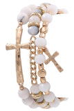 Set of three multi-beaded stretch bracelets in neutral tone colors. One white marbled beaded stretch bracelet with hammered gold tone center cross. One beaded stretch bracelet with facetted white beads with gold tone accents and a hammered gold tone cross dangle pendant. One beaded stretch bracelet with wit white and grey facetted beads with gold tone beaded accents and gold tone chain link. Wear them alone or separate.