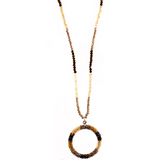 This necklace will brighten anyone's day with the gorgeous mixture of shades of brown color and just enough sparkle to light up your day. This necklace features multi-color glass beads with a beaded circle pendant.