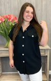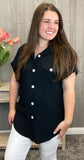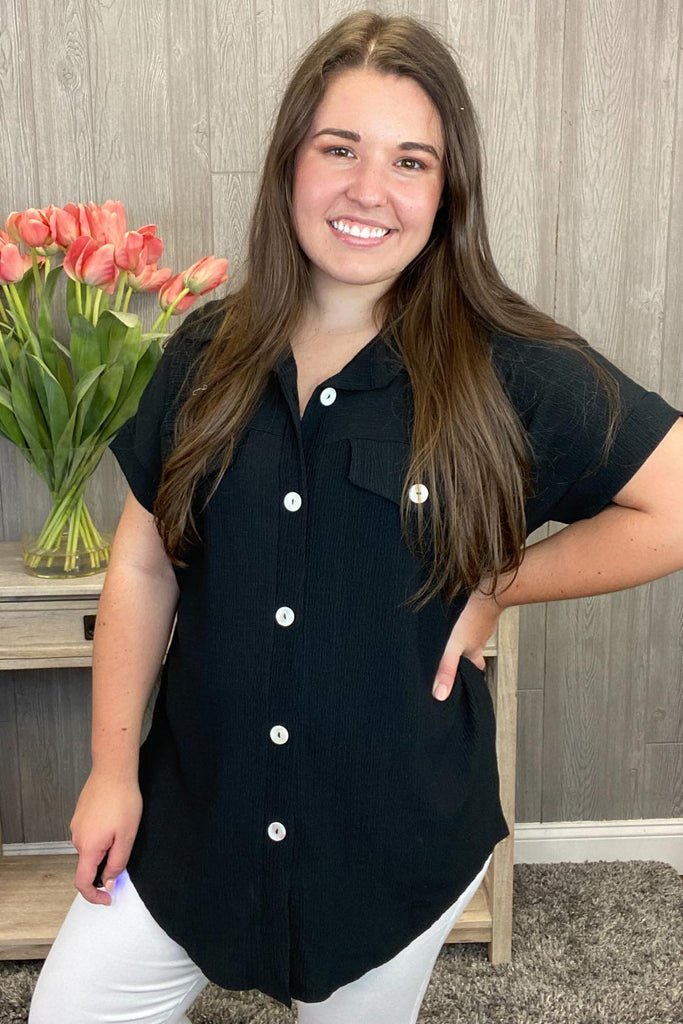 Our Casual Cocktail Top features a classic solid black top with a stylish collar, button front, and two front pockets. The short sleeves make it the perfect piece for a warm summer day. Perfect for a chic casual look or a relaxed office look. Lightweight crinkle type material.