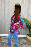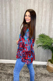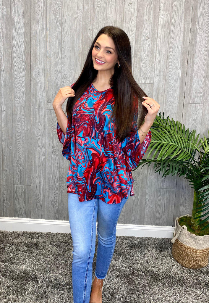 Check out this super cute and comfy top. This top features a fun red and blue swirl pattern with a v-neckline. We love the bell sleeve on this cute top! Dress this up or down!