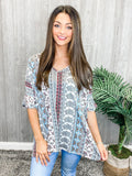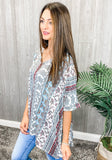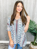 We never grow tired of this poncho style top. This pretty poncho style top features a v-neckline with half sleeves and a comfy relaxed fit. This adorable mixed print top is super soft and very wearable. Pair it with jeans or shorts for a casual look or pants for a dressier look.