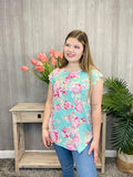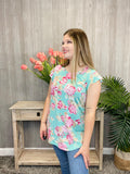 Who doesn't love floral print on a mint background?! This short sleeve tunic is our favorite wrinkle-free material. It has super cute ruffled short sleeves and a v-neckline. Pair with white pants or denim!