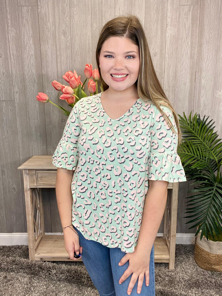 Who doesn't love a light sage and animal print pairing?! We love the white leopard on this top and the cute, ruffled bell sleeves. This top feels like your favorite t-shirt but is so much better. This would look great paired with denim, white, or even black pants!