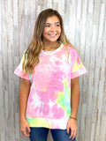 Stay cute and comfy in this tie dye favorite! This top is super cute and easy to throw on with some shorts, jeans, or even leggings. The colors in this tie dye are stunning and so fun!