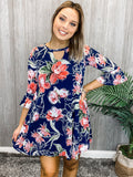 This tunic dress features a gorgeous floral print, 3/4 length sleeves, a-line fit, and a cute cutout neck detail. Rock this with wedges or pair it with leggings.