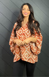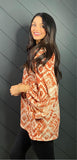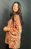 A stunning rust color paired with aztec print makes this top a must have!! We also can't get enough of the adorable balloon sleeves that this has. Pair it with denim jeans for your go to outfit!