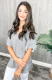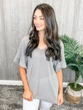 This lightweight flirty gray stripe top is perfect for your closet. It features a diagonal stripe, center stripe, v-neck, and ruffle sleeve. This pretty top pairs perfectly with pants or shorts. Make this cute flirty top near and dear to your closet.
