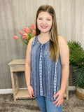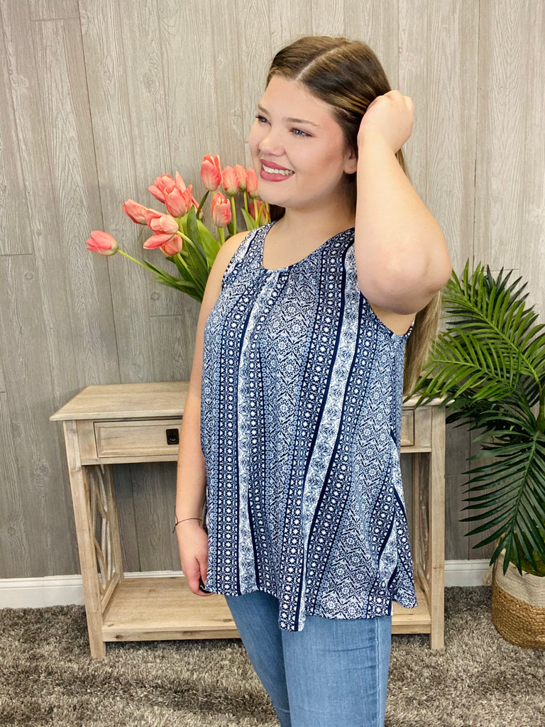 This butter soft white and navy top is great for summer! It has a super cute multi-pattern patchwork print, is sleeveless, and bra friendly! Don't miss out on this one!