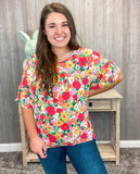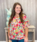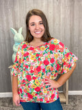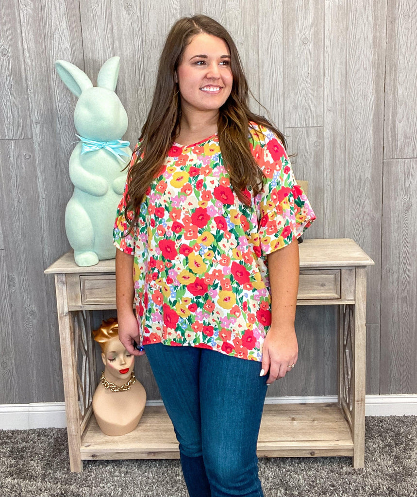 Bring a little magic into your closet with this Beautiful floral print top. This woven top features a bold and beautiful floral print with short ruffle sleeves and a v-neckline. This top has a high low hemline.