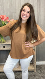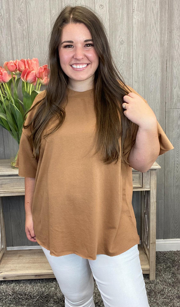 Introducing the Tranquil Soul Top, a chic casual top in solid camel. With dropped shoulders, raw edge hem and sleeves, ribbed neckline, and French terry construction, this relaxed fit top will be your go-to for effortless styling. Step into comfort and style with this essential top.