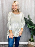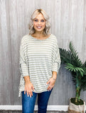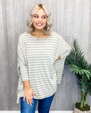 We are swooning over these designer-inspired stripes! 😍 This oversized relaxed fit it perfect for those days that call for comfort. This top features a soft crinkle fabric with sage and ivory stripes. Pair this with some skinny jeans for an effortless styled look.