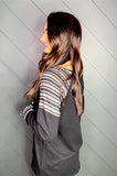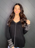 Leave a good impression with this cute solid black top with exposed seams on the center front and neckline. Other cute features include a mixed print sleeve and shoulder and v-neckline.