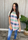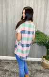 This sweet and flirty plaid top is so soft you'll never want to take it off! With pastel pink, sage, and a muted navy this is great for spring! It's super lightweight and would look cute paired with denim shorts!
