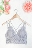 Our Anyday bralettes are perfect for every day! This mocha grey color is gorgeous and a great neutral. Features double straps, floral lace padded front with removable pads, criss cross back detail, and scalloped edges. Smocked bandeau back with adjustable elastic straps.