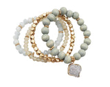 Set of four multi-beaded stretch bracelets with gold and grey dangle charm. Colors include hues of grey and gold. Wear them together or alone.
