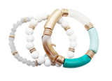 Set of three coordinating multi beaded stretch bracelets. One faceted grey and gold tone beaded stretch bracelet. One white and gold tone beaded stretch bracelet. One chunky turquoise, white, cream, mint, and gold beaded stretch bracelet. Wear them together or alone.