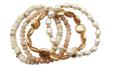 Set of 4 beaded bracelets. One natural wood with gold tone accents beaded stretch bracelet. One gold tone beaded disc stretch bracelet. One beaded pearl and gold tone stretch bracelet. One neutral beaded stretch bracelet with gold tone accents. Wear them together or alone. Mix and match them with other bracelets.