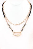 Double layer necklace with one gold tone chain layer and one dalmation stone and black beaded layer with gold tone locket center pendant.