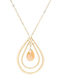 Delicate long gold tone chain with neutral beaded double teardrop pendants with center faceted pale pink pendant.