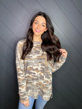 Steal the show in this super soft and comfy brushed camo top. This soft top features muted colors, long sleeves and a round neckline.