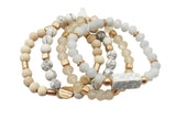 Set of four multi-beaded stretch bracelets. Colors include natural wood, grey, gold, and white. Wear them together or alone.