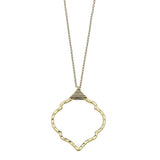 This worn gold quatrefoil pendant necklace is simple and easy making it a perfect outfit staple. Chain wrapped quatrefoil pendant on worn gold tone chain.
